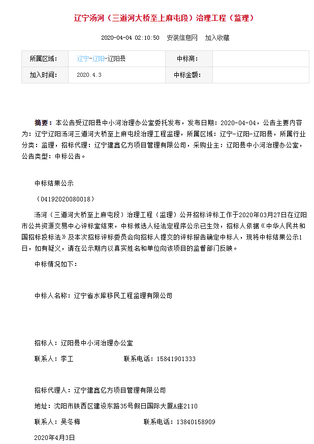 遼寧省水庫移民公司中標(biāo)蓋州市碧流河(葦塘——西扒山段)河道治理工程(2020年項(xiàng)目)監(jiān)理...