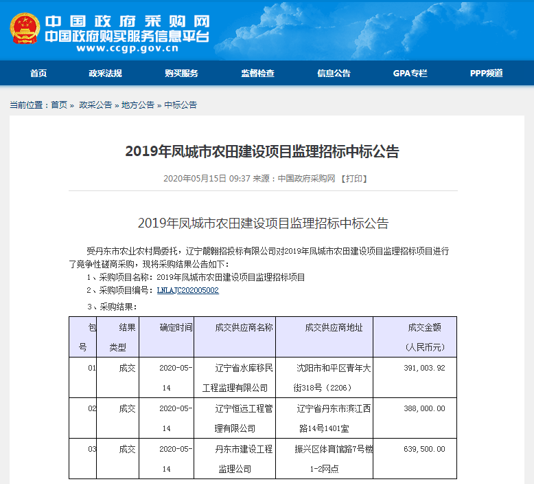 受丹東市農(nóng)業(yè)農(nóng)村局委托,遼寧龍翱招投標有限公司對2019年鳳城市農(nóng)田建設(shè)項目監(jiān)理招標項目進行了競爭性磋商采購,采購項目編號:LNLAJC202005002,采購人確認,確定遼寧省水庫移民工程監(jiān)理有限公司為中標。