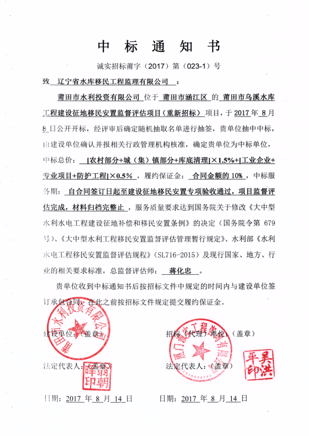 2017年8月8日公開開標(biāo),經(jīng)評審后確定隨機(jī)抽取名單進(jìn)行抽簽,遼寧省水庫移民工程監(jiān)理有限公司抽中中標(biāo),由建設(shè)單位確認(rèn)并報相關(guān)行政管理機(jī)構(gòu)核準(zhǔn),確定遼寧省水庫移民工程監(jiān)理有限公司為中標(biāo)單位。